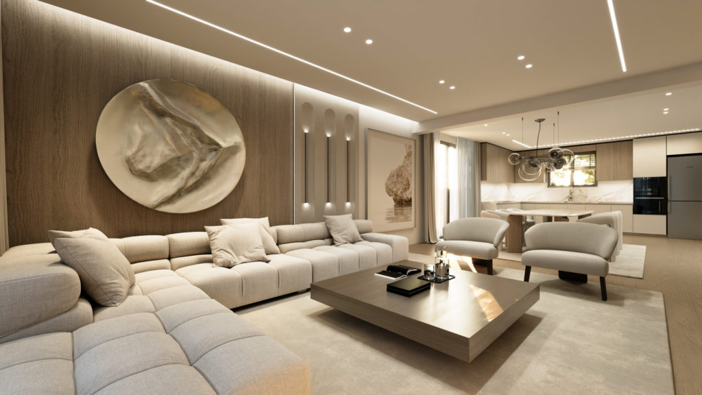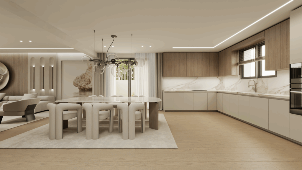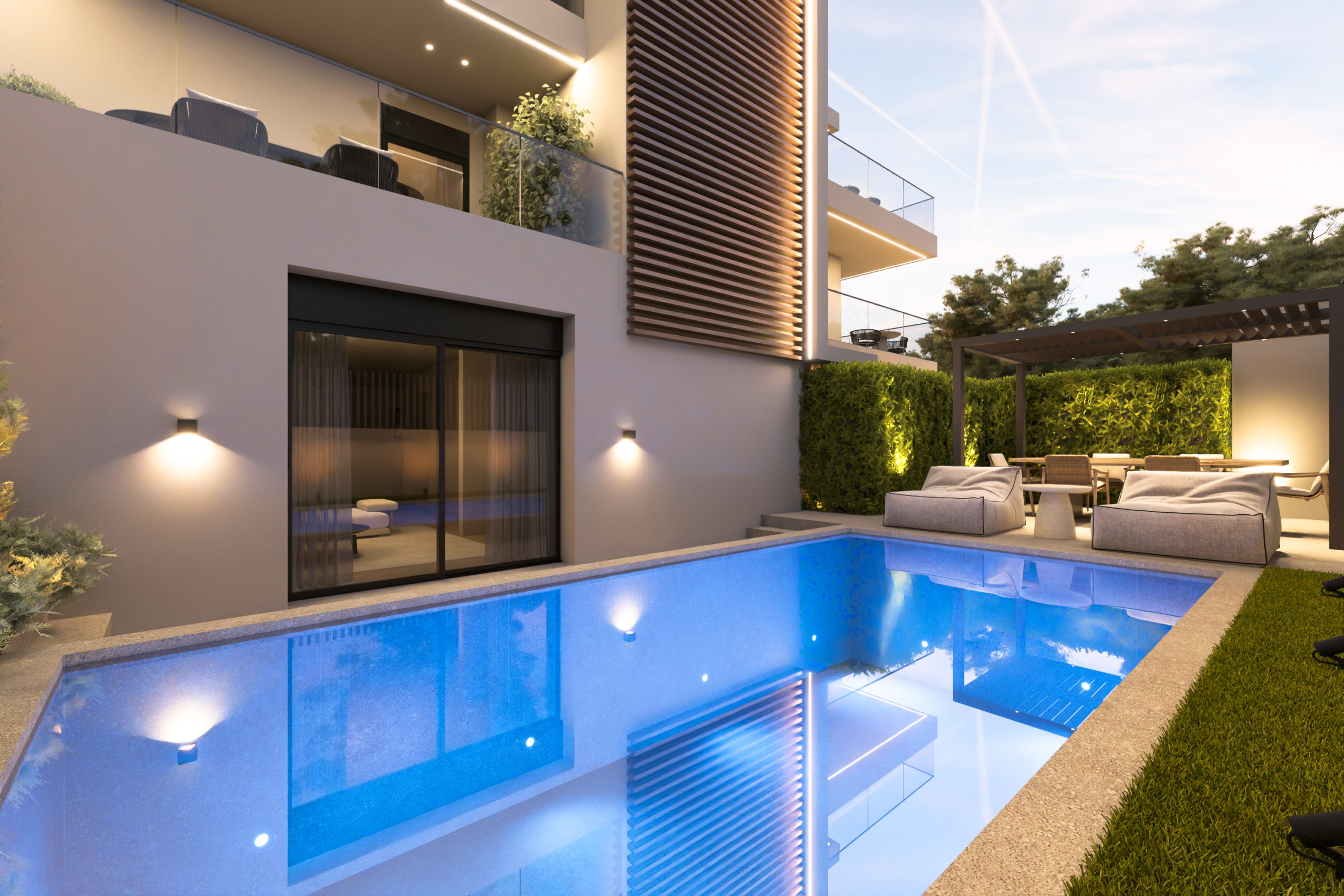 Το ισόγειο στεγάζει έναν φωτεινό, ενιαίο χώρο καθιστικού και κουζίνας, του οποίου η θέση και τα μεγάλα ανοίγματα εξασφαλίζουν πλήρη θέαση προς τον κήπο. Η χωρική συνέχεια ενισχύεται με αρχιτεκτονικά στοιχεία όπως πέργκολες και υψηλή δενδροφύτευση, που προσδίδουν ιδιωτικότητα και οικειότητα. Ο εξωτερικός χώρος περιλαμβάνει ιδιωτική πισίνα και συνολικό εμβαδόν αποκλειστικής χρήσης 115,8 τετραγωνικών μέτρων, διαμορφωμένος με φυτεύσεις και σκιάσεις.
