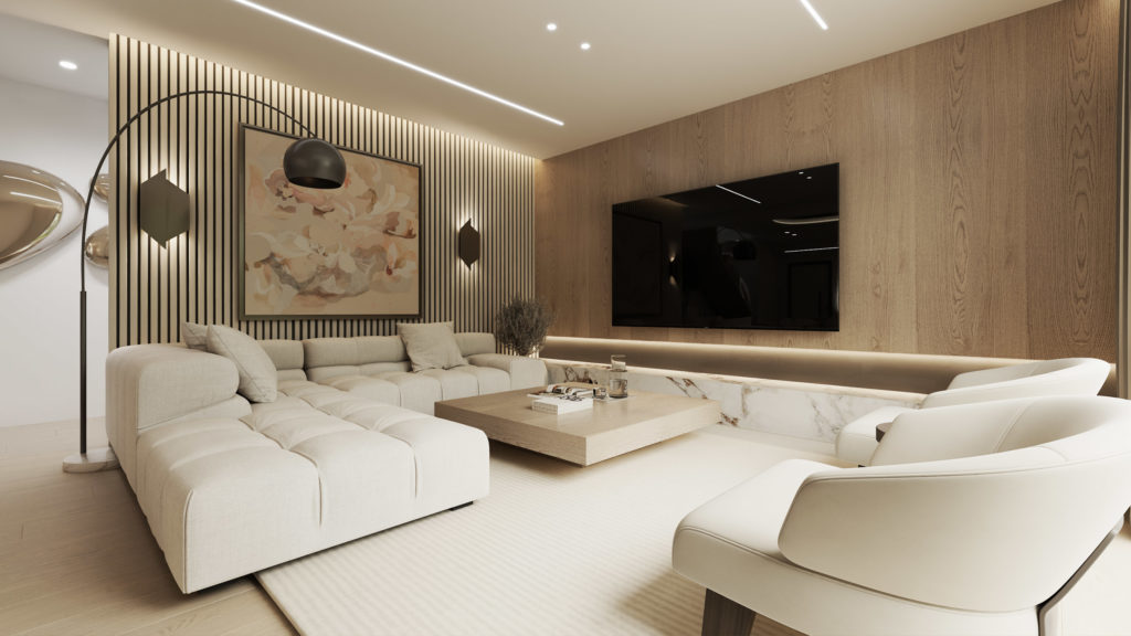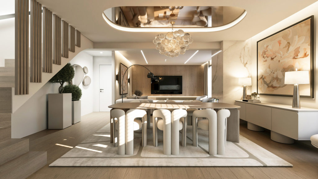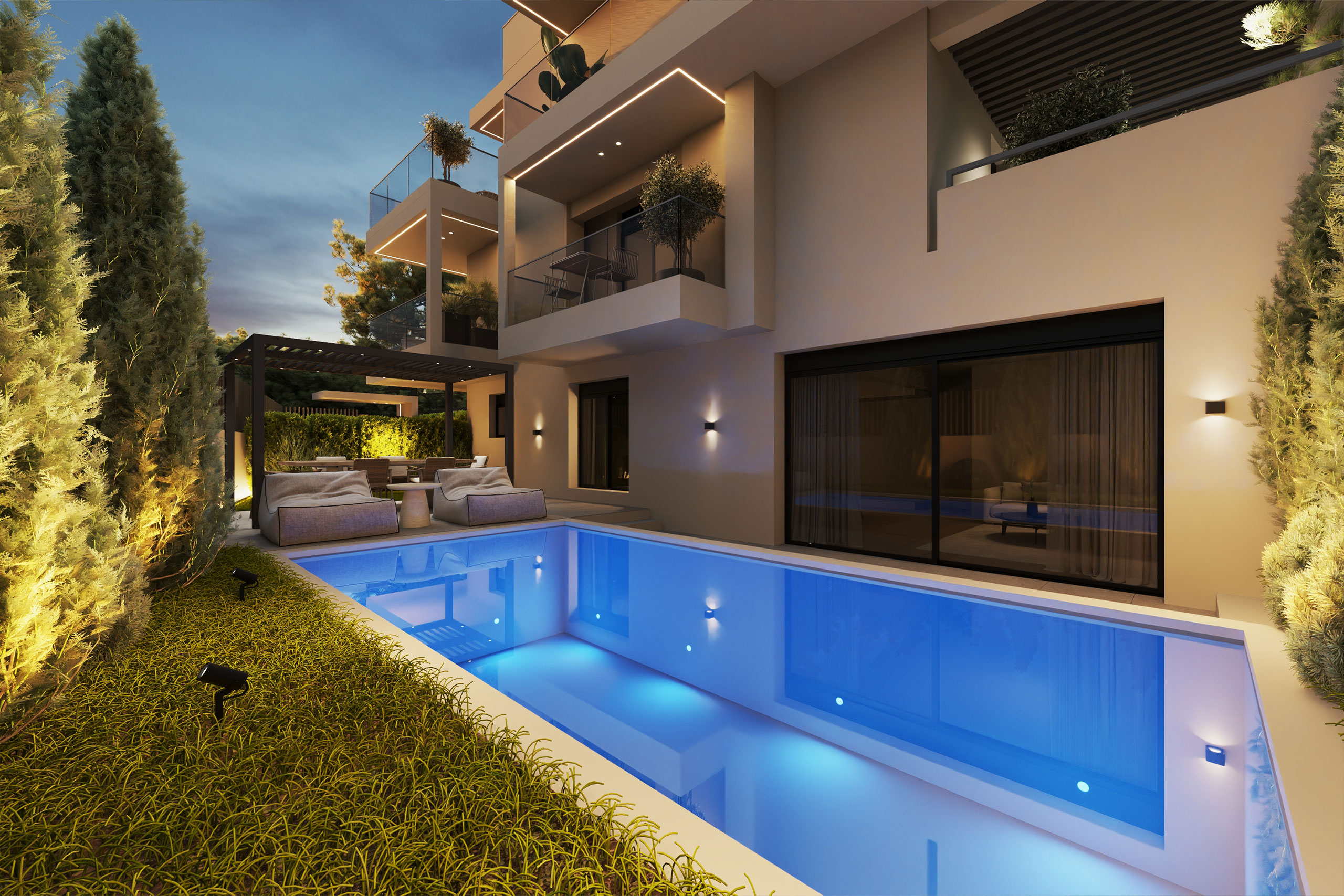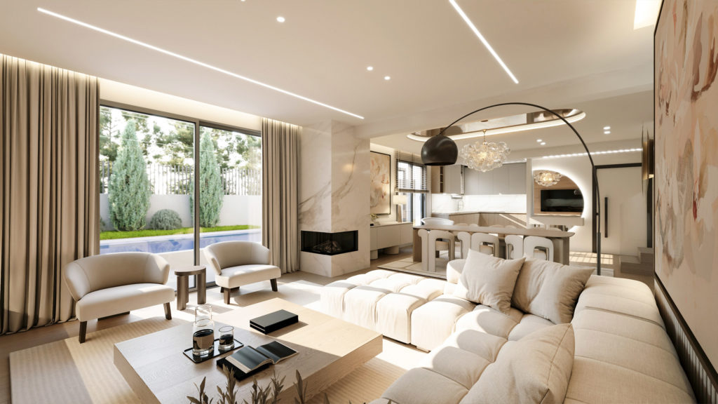 Το ισόγειο διαθέτει έναν επιβλητικό ενιαίο χώρο καθιστικού και κουζίνας με WC επισκεπτών, ο οποίος ανοίγει απευθείας προς τον ιδιωτικό κήπο. Τα μεγάλα υαλοστάσια αναδεικνύουν τη σύνδεση με τον εξωτερικό χώρο, όπου διαμορφώνονται ζώνες σκίασης, φυτεύσεις και μια κομψή ιδιωτική πισίνα. Η συνολική έκταση του κήπου φτάνει τα 78,1 τετραγωνικά μέτρα, προσφέροντας πολλαπλές δυνατότητες αξιοποίησης και χρήσης.